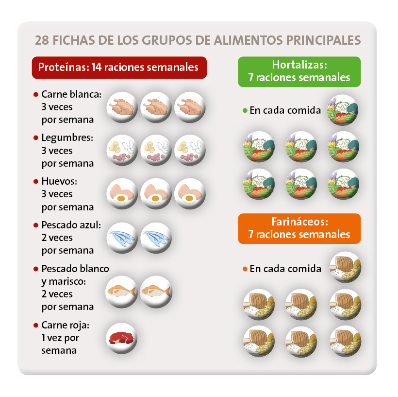 28 fitxes magnètiques que es corresponen amb les diferents racions dels grups d'aliments principals que es recomanen consumir durant els set dies de la setmana.